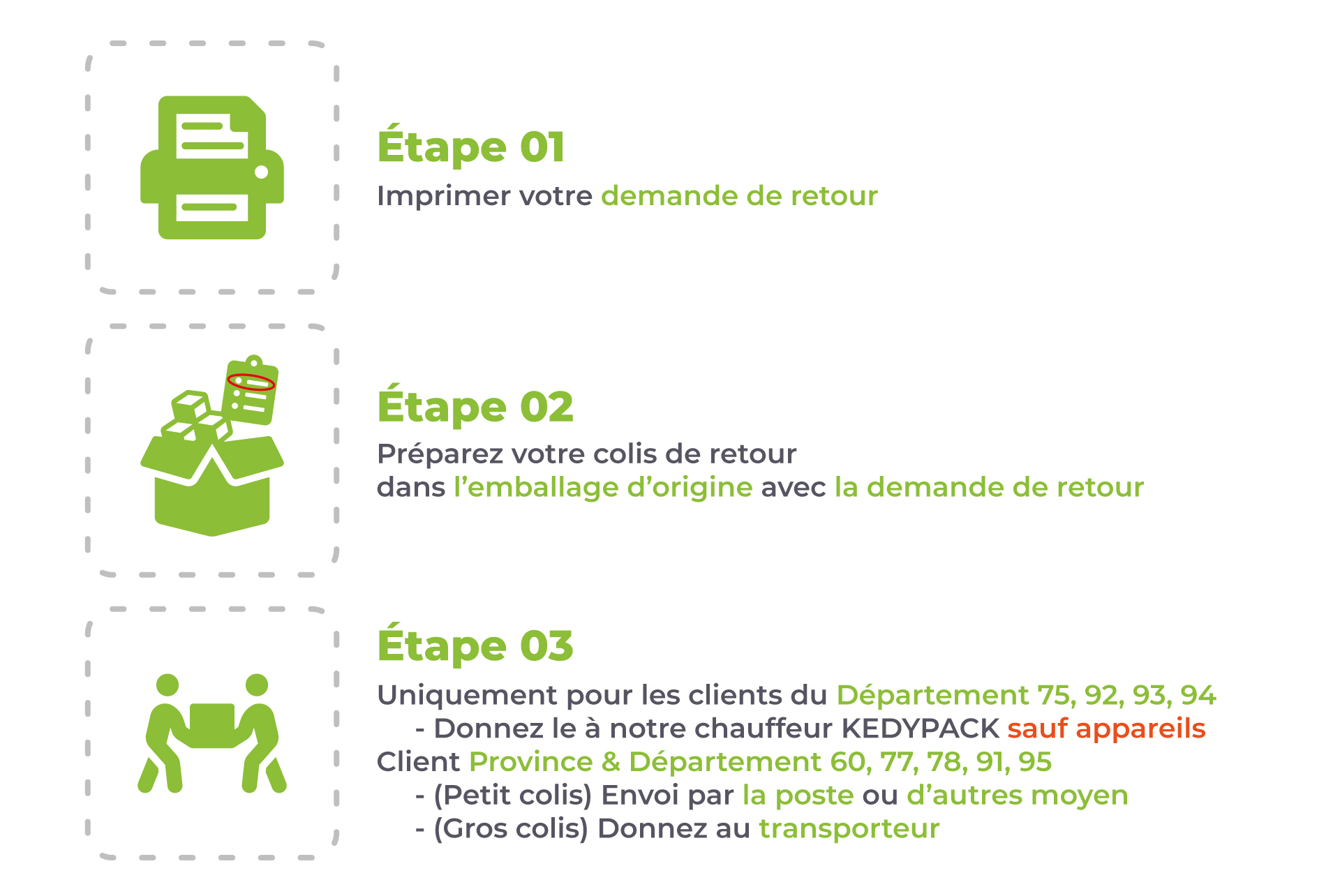 Pour toute commande passée sur le site WWW.KEDYPACK.COM, le client dispose de 15 jours pour effectuer un retour à compter du jour de la réception de la commande Retour GRATUITS uniquement pour les clients du département 75/92/93/94. Sauf appareil, En cas de panne, les frais d'acheminements de l'appareil au point de réparation et de retour sont à la charge de l'acquéreur..(Délai de retour indicatif du colis 10 à 15 jour)