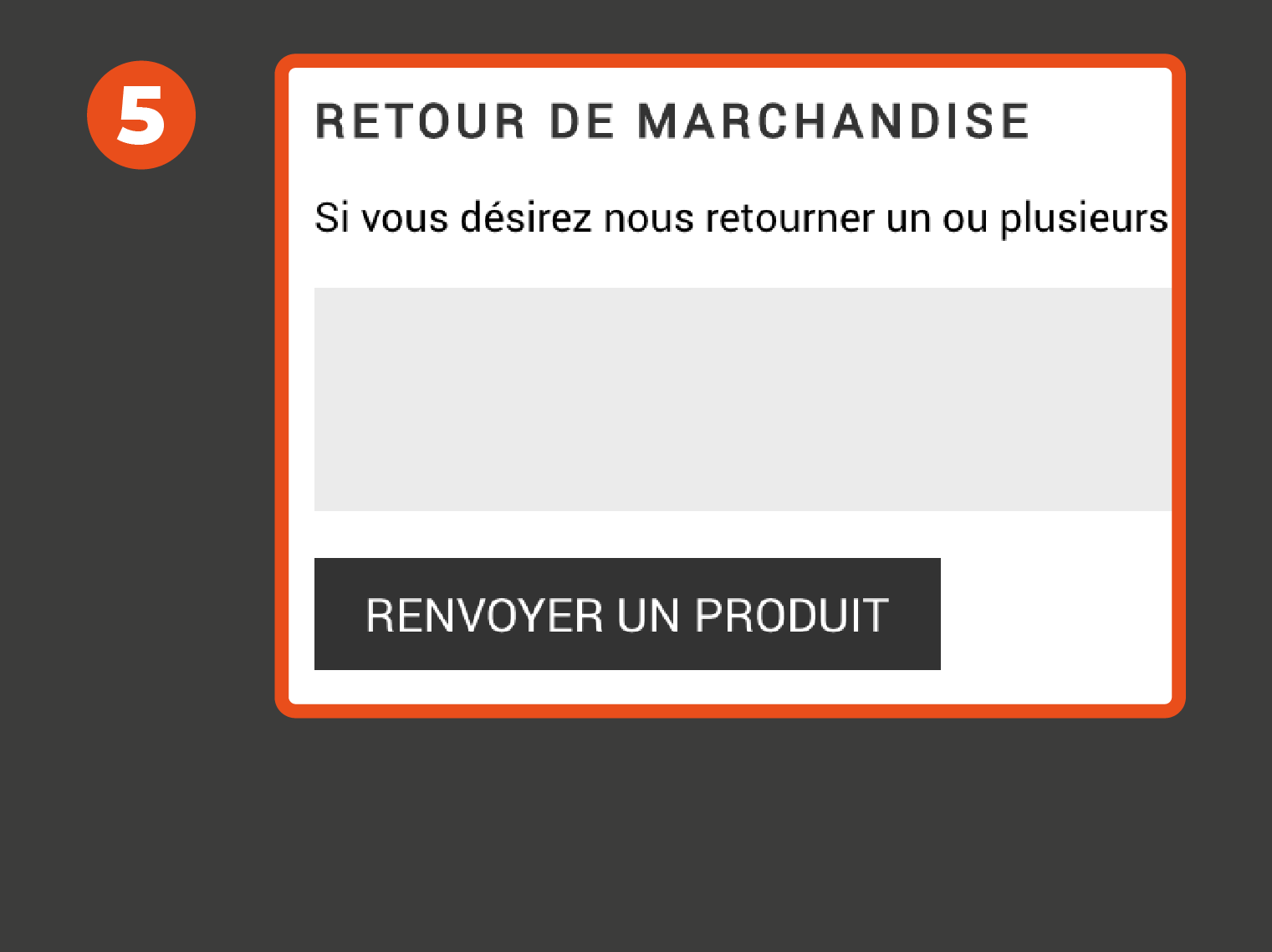 (1) Connectez vous --- (2) Mes Commandes --- (3) cliquez sur 'Détail' de la commande concernée --- (4) cliquez sur le carré situé à gauche de chaque produit et sélectionnez la quantité retournée --- (5) indiquez le motif de votre retour et cliquez sur ' renvoyer un produit ' .(1) Connectez vous --- (2) Mes Commandes --- (3) cliqué sur 'Détail' de la commande concerné --- (4) cliqué sur le carré situé à gauche de chaque produit et sélectionné la quantité retourner --- (5) indiqué le motif de votre retour et cliqué sur ' renvoyer un produit ' .